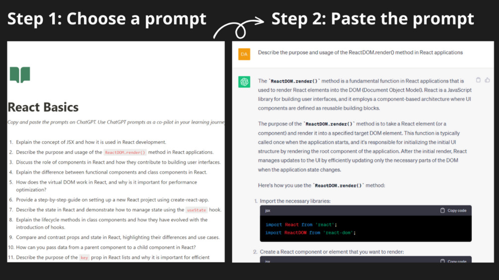 The prompts in our guide are designed to be highly interactive. Some prompts are ready-made, providing immediate insights and solutions to common challenges. Others generate personalized information and guidelines based on your specific learning needs. This dynamic approach ensures that you receive tailored guidance and answers to your unique questions, enhancing your understanding of React concepts and boosting your coding skills.